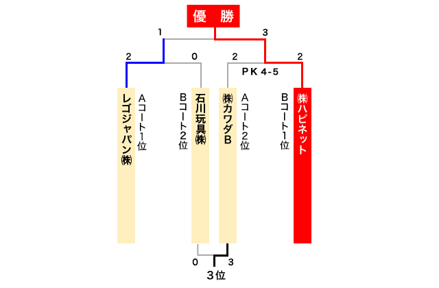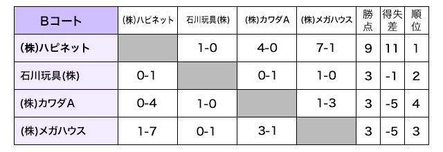 勝ち点が同一の場合は得失点差・総得点・直接対決の勝敗、ジャンケンの順で決めます。